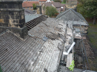 The pitch roof and flat roof structures had become dilapidated over the years requiring remedial joinery, slate and lead works on fourteen pitch roof elevations, and remedial works across nine flat roof elevations. The stone build fabric was also damaged at various locations including numerous chimney stacks. Approximately 70 tons of reclaimed Westmorland green slate was installed on the pitch roof elevations as per the conservation requirements.